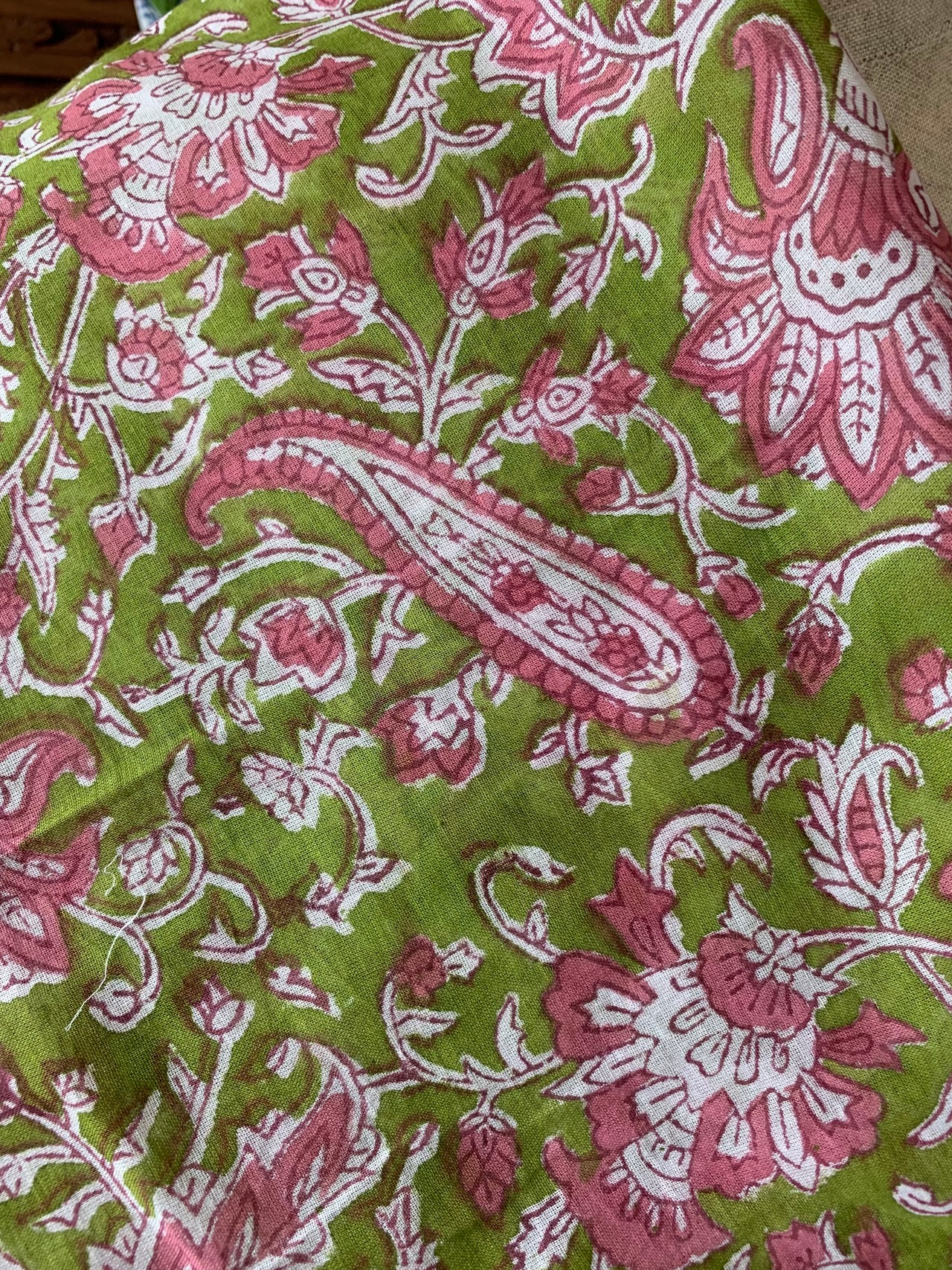 ハンドブロックプリントの色付けに、植物染料を使用しております。気になる場合は風通しの良い場所で、陰干しすると匂いは薄れてきます。